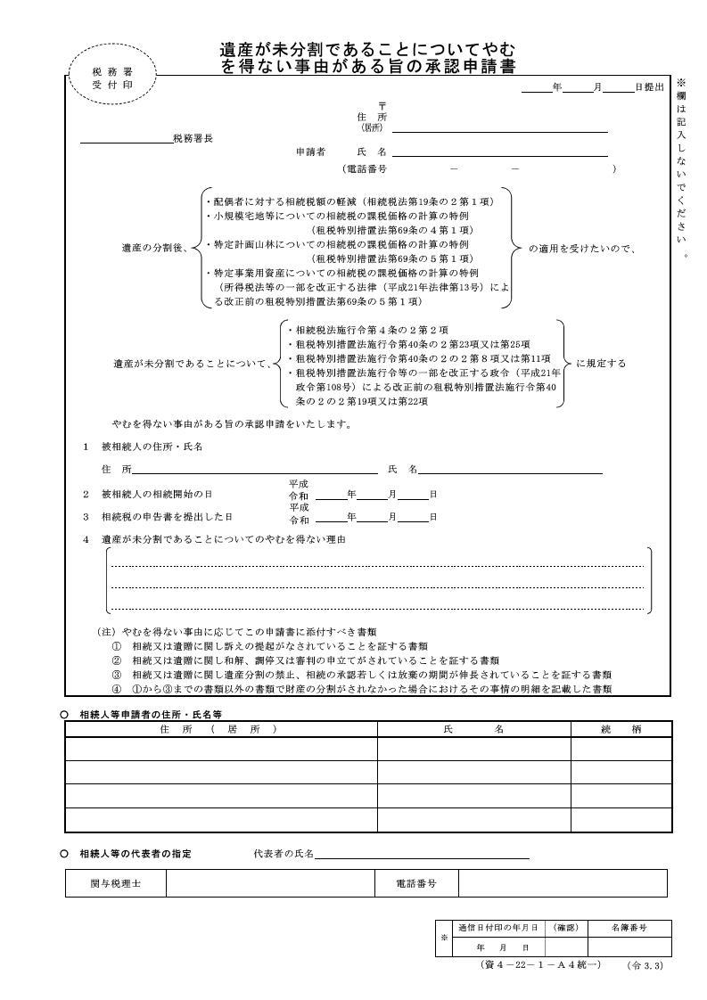 その際に、「申告期限後3年以内の分割見込書」を併せて提出することで、期限後3年以内まで特例の適用期間が延長でき、「遺産が未分割であることについてやむを得ない事由がある旨の承認申告書」を申告期限後3年が経過する日の翌日から2ヶ月を経過する日までに、所轄の税務署長に提出することで、3年以内という期限を延長することができます。